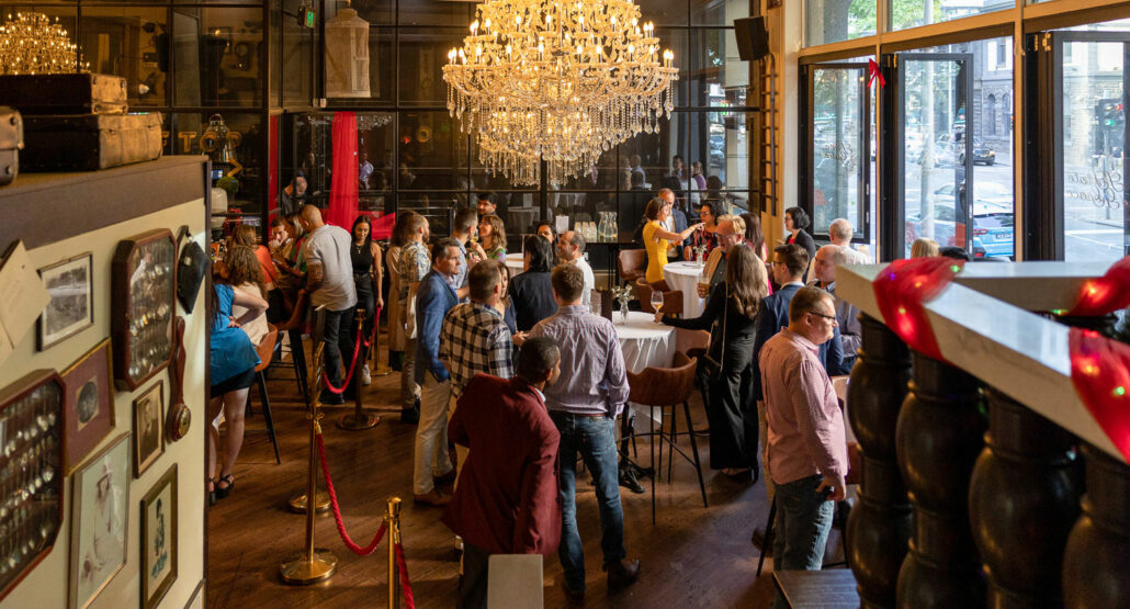 Enjoy premium beverages & canapés in the street level bar under sparkling chandeliers. With ceiling high windows that span across the room and a view onto bustling King St, this space has it all. Perfect for your next cocktail affair, with direct bar access and a uniquely presented space.